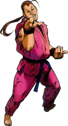 Dan is introduced in Street Fighter Alpha and Street Fighter Alpha 2 as a martial artist who developed his own fighting style called Saikyō-ryū, "The Strongest Style", despite the considerable lack of power in his techniques. During these two games, Dan seeks to defeat Sagat to avenge his father's death.[1][2] While Dan is an unlockable character in Street Fighter Alpha, in following games he is already available.[3] By Street Fighter Alpha 3, Dan has succeeded in his quest (As Sagat purposefully threw the fight out of pity) and seeks to perfect and promote his fighting style.[4] In this game, he also declares himself the mentor of the fighter Sakura Kasugano and is revealed to be one of Blanka's friends.[5][6]