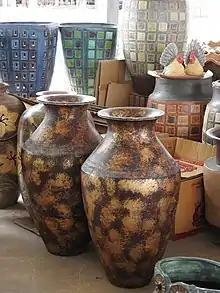 Starting around 1972, decorative ware started to be made in Dan Kwian to serve a new market of urban consumers centered in Bangkok. University-based designers became involved with developing new products for hotels and other public spaces as well as private homes. At first this decorative ware consisted simply of water jars ornamented with carved decoration. Gradually the decorative ware expanded to include varied ornamental vessel forms, clay tile, carved ceramic murals, ceramic jewellery, and free-standing sculpture.[5][6][7] Other media are also now produced in Dan Kwian, most notably cement-based carved sandstone replicas.[4]