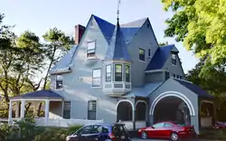 The Daniel Webster Robinson House stands on the north side of Main Street, just west of the main UVM campus, between South William and South Willard Streets. It is a three-story wood-frame structure, basically rectangular, with its massing obscured by a wealth of asymmetrical architecture typical of the Queen Anne period. The front facade features a low projecting turret on the second level at the right corner, with a wraparound porch that is open across most of the front, with a roofed corner pavilion at the left, and a covered porch on the right side that continues to a shingled porte-cochere with rounded opening. The front-facing cross gable of the main roof has a window set in it, below which is a corbel-like bulge. The interior of the building retains a significant amount of original woodwork and other decorative elements, despite its extended use as a sorority house. The period carriage house, which is also finely crafted, stands behind the main house, and has been converted to residential use.[2]