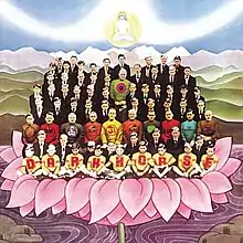 The cover shows a 1956 Liverpool Institute high-school photograph[193] superimposed on a watercolour painting, which Wilkes created in response to Harrison's request for an Indian effect.[194] The photo sits inside a lotus flower and is surrounded by a dream-like Himalayan landscape that extends to the horizon.[195] At the top of the image, the Indian yogi Mahavatar Babaji floats in the sky,[195] representing Krishna.[196][197] As the founding yogi of the Hindu Nath tradition, Babaji introduced Kriya Yoga, which is said to destroy bad karma brought about by past deeds.[195][nb 15] In the Liverpool Institute photo, a thirteen-year-old Harrison is pictured in the centre of the top row, his face tinted blue; school teachers appear dressed in long-sleeve tops bearing superimposed record-company logos or other symbols.[195] Harrison said he gave the unapproving headmaster the bull's-eye Capitol logo[190] whereas the art teacher, who Harrison liked, received the Om symbol.[200][201] Wilkes and Harrison disagreed over the inclusion of the Babaji image, which the designer disliked and reduced in size for the LP's initial pressing.[195]