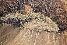 Half Mountain, Dasht-e Kavir Desert. This small mountain is fault-bounded at its south edge. The alluvium is about 900 meters (2,900 feet) lower than the summit (labelled). Image is about 17 kilometers (10 miles) wide.