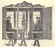 The Davenports were exposed in September, 1865 in Paris after one of the committee men noticed the ropes on the floor were not the originals.[3] A spectator rushed the stage, "put his hand on the bench round which the cords are wound, touches a spring, the bench bends in the middle, and the cords fall at the feet of the captives". The crowd were angry and highjacked the stage but the French Gendarmerie were able to restore order after promising a refund. During the riot the Davenports escaped the theatre.[3]