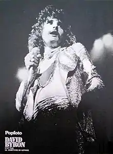 David Garrick (29 January 1947 – 28 February 1985), better known by his stage name David Byron,[3] was a British singer, who was best known in the early 1970s as the original lead vocalist of the rock band Uriah Heep.[4] Byron possessed a powerful operatic voice and a flamboyant stage presence.