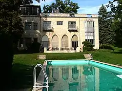 The David Hall House is a historic house at 25420 W. Cedar Crest Lane in Lake Villa, Illinois. The house was built in 1931 for David and May Cave Hall, a wealthy couple who settled in Lake Villa after taking summer vacations there for many years. Architect Ralph Wesley Varney designed the building in the Art Deco with elements of popular revival styles of the period. An unusual choice for a residential building, the use of Art Deco was likely inspired by May's travels to Hollywood in the 1920s. The house's design includes a rusticated limestone exterior, large Gothic arch windows, a triangular canopy above the entrance, a metal oriel window, and a stepped roof. Its grounds include a swimming pool and terrace garden.[2]