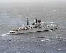 Hart Dyke was conscripted for National Service in 1959, and served as a midshipman in the Royal Naval Volunteer Reserve on Battleaxe.[2] He then joined the Royal Navy and was trained at the Britannia Royal Naval College at Dartmouth,[3] and served aboard the frigate Eastbourne, based in the Far East and Persian Gulf.[2] He was commissioned as a sub-lieutenant on 1 September 1961, and was promoted to lieutenant on 1 January 1962,[4] to command a Gay-class fast patrol boat based at Plymouth. He served aboard the Ton-class minesweeper Lanton during the Indonesian Confrontation in 1963, then as navigating officer aboard the frigates Palliser on fishery protection duties in 1963–1965, Gurkha in the Persian Gulf, 1965–1966, and Tenby in the Dartmouth Training Squadron, 1966–1968, before being appointed an instructor at the Royal Naval College, Dartmouth,[2] where he was promoted to lieutenant commander on 1 January 1970.[5] He attended a year-long staff course[2] before being promoted to commander on 30 June 1974[6] and appointed first lieutenant and executive officer of the guided missile destroyer Hampshire.[7] From 1976 he served on the staff of the Royal Naval Staff College, then from 1978 as the commander of the Royal Yacht Britannia.[7][8] He was made a Member of the Royal Victorian Order (4th class) (MVO) on 1 January 1980.[9]