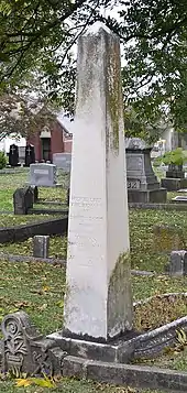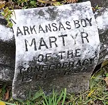 A monument memorializes Dodd's hanging in MacArthur Park next to the former Arsenal. Dodd's grave is marked by an eight-foot marble monument, engraved "Here lies the remains of David O. Dodd. Born in Lavaca County, Texas, Nov. 10, 1846, died Jan. 8, 1864." Nearby is a marble scroll with the words "Boy Martyr of the Confederacy."[1] David O. Dodd Elementary School in southwest Little Rock is located on land that was once a part of Washington Dodd's farm. A stone marker on school grounds, believed to be the place where he was captured, was erected by the David O. Dodd Chapter of the United Daughters of the Confederacy, Pine Bluff, Arkansas, and is dedicated to "Arkansas' Boy Hero of the War Between the States."[8]