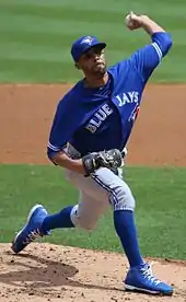 On July 30, 2015, Price was traded to the Toronto Blue Jays for Daniel Norris, Matt Boyd and Jairo Labourt.[29] Price made his debut for the Blue Jays on August 3. He threw 119 pitches in 8 innings, recording 11 strikeouts and a winning decision, while yielding only 3 hits, 2 walks, and 1 earned run in a 5–1 victory over the Minnesota Twins at Rogers Centre. His 11 strikeouts tied José Núñez's team record for most strikeouts in a Blue Jays' pitching debut.[30] On September 5, Price earned his 100th career win, by beating the Baltimore Orioles 5–1.[31] He was scratched from his final start of the season on October 1, as the Blue Jays had clinched the AL East the previous day.[32] Price made 11 starts for the Blue Jays in 2015, and went 9–1 with a 2.30 ERA and 87 strikeouts in 74+1⁄3 innings.[10] Price started Game 1 of the ALDS for the Blue Jays, taking the loss and bringing his career postseason record to 1–6. He would earn his second career postseason win on October 12, pitching 3 innings in relief of R. A. Dickey's game 4 start.[10]