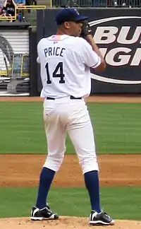 Prior to the season, Price announced that he was changing his uniform number from 24 to 10, a tribute to his son Xavier, since "X" represents the Roman numeral ten.[53] Price began the season as a member of the starting rotation, pitching to a 1–2 record with 3.75 ERA in six starts, until being placed on the injured list on May 6, retroactive to May 3, due to left elbow tendinitis.[54] He was activated on May 20,[54] starting and getting the win in a game against Toronto. From May 20 to July 7, Price won 6 straight decisions.[55] Price was briefly on the paternity list in early August,[56] as his wife gave birth to their second child;[57] at the time, he had a 7–4 record with 3.86 ERA in 20 starts, with 123 strikeouts in 102+2⁄3 innings. Price was placed on the injured list on August 8, retroactive to August 5, due to a left wrist triangular fibrocartilage (TFCC) cyst.[56] He was activated from the injured list on September 1.[58] He pitched that day, then was held out of the rotation due to additional concern about his wrist.[59] He did not pitch again during the season, finishing with 22 appearances (all starts), recording 128 strikeouts in 107+1⁄3 innings and a 7–5 record with a 4.28 ERA.[10]