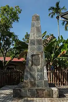 The attack seemed to be forgotten as in 1911, according to the "British North Borneo Herald", J. W. Wilson was probably the only British North Borneo resident who remembered the incident.[3] The tree where the incident occurred has been regarded as the site for the memorial and known as the "Government Tree". However, as the tree had fallen, the Resident at the time proposed erecting a small pillar on the site and fencing it in as a perpetual memorial.[3] An obelisk was built later in September 1912 on the location where Captain De Fontaine was attacked.[4]