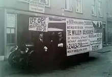 Two years later, independently from De Dageraad, the Kiesvereeniging Vrijdenkers naar het Parlement ("Electoral Association Freethinkers into Parliament", 1922–1925) was founded by some of its members, who wanted to do battle against all that "bears a slight likeness to God and servility towards God".[20] It resisted capitalism and militarism with the slogan 'The Netherlands out of the Church's grip', pleaded for an absolute separation of church and state, and free public education. Although Catholics constantly besmirched election posters, or pulled them from the walls, the Electoral Association managed to get 1100 votes (0.4%) in the constituency of Amsterdam.[21] After participating in five constituencies during the 1925 elections, with an average result of just 0.12% per constituency, the party disappeared again. On the other hand, most freethinkers quickly lost their sympathy for Fascism when that evolved into a violent movement that embraced Catholicism and capitalism. To expose the opportunism of Mussolini and pope Pius XI (who would sign the Lateran Treaty soon after), De Dageraad in 1928 published a speech by Mussolini from 1904 in which he disproved the existence of God.[21] Confronted with the rise of totalitarian forms of both Fascism and Communism, Dageradianen started to defend parliamentary democracy more and more, even though both extremes and anarchism continued to be represented within the association.[22]