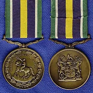 The De Wet Medal is a military long service medal which was instituted by the Republic of South Africa in 1987. It was awarded to members of the Commandos, the rural defence component of the South African Defence Force, for ten years of efficient service and good conduct.[1]