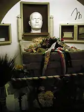 The authorities then arranged for the body to be hidden at a Capuchin monastery in the small town of Cerro Maggiore where it remained for the next eleven years. The whereabouts of the body was kept a secret, even from Mussolini's family.[71] This remained the position until May 1957, when the newly appointed Prime Minister, Adone Zoli, agreed to Mussolini's re-interment at his place of birth in Predappio, in Romagna. Zoli, who also came from Predappio and knew Mussolini's widow, Rachele, was reliant on the far right to support him in Parliament. This included Leccisi himself, who was now a neo-fascist party deputy.[72]