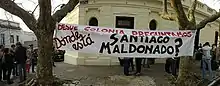 On September 1, 2017, a month after Santiago Maldonado's disappearance, thousands of people expressed themselves through rallies and demonstrations asking for his appearance alive. The largest demonstration took place in Plaza de Mayo and was organized by Grandmothers of the Plaza de Mayo, Mothers of the Plaza de Mayo (Línea Fundadora), Relatives of the Disappeared and Imprisoned for Political Reasons, HIJOS, the Center for Legal and Social Studies (CELS), the Argentine League for the Rights of Man, and the Permanent Assembly for Human Rights, among other organizations.[66] In other cities, such as Mendoza, Mar del Plata, San Luis, San Juan, Neuquén, Salta, Posadas, Jujuy, Santiago del Estero, Villaguay, Concepción del Uruguay, Gualeguaychú and Concordia there were rallies and demonstrations with the same demand.[67] In Rosario and Córdoba there were rallies with an attendance of 40000 each.[68][69] There were also protests in Spain, Brazil, France, Uruguay, Chile, Mexico, Austria and the United States which were organized through social media.[70][71] In London,[72] São Paulo and Madrid, groups of people expressed their solidarity with the demand for the appearance of Santiago Maldonado alive.[73][74][75]