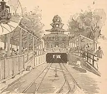 The station buildings at the stops were visible from afar sights to attract the passengers. The son of one of the concessionaires, Louis Gaillot, a young architect, gave them shapes of unusual originality and functionality. The awnings, which covered the platforms, protected the passengers from the weather. At the final stations, the passengers could meet and rest at buffets.[4]
