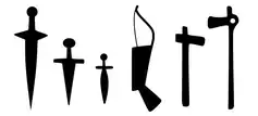 The leaders depicted in these deer Stones (dated to 1400-700 BCE) were equipped with weapons and instruments of war, such as swords, daggers, knives, shafted axes, quivers, fire starters, or curved rein holders for their chariots.[45] Weapons and tools can be seen throughout all the stones, though weapons make a stronger appearance in the Sayan-Altai stones.[1] Bows and daggers appear frequently, as well as typical Bronze-Age implements, such as fire-starters or chariot rein holders.[17] The appearance of these tools helps date the stones to the Bronze Age.
