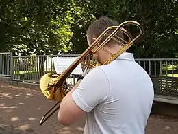 ![]() Trombonist playing the hymn in a procession for Corpus Christi | |