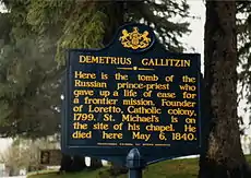 16. One or more of the preceding sentences incorporates text from a publication now in the public domain: Chisholm, Hugh, ed. (1911). "Gallitzin, Demetrius Augustine". Encyclopædia Britannica. Vol. 11 (11th ed.). Cambridge University Press. p. 421.