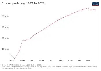 According to the CIA World Factbook, in 2019, life expectancy was 78.3 years for the total population, 75.6 years for men and 81.0 years for women.[10]