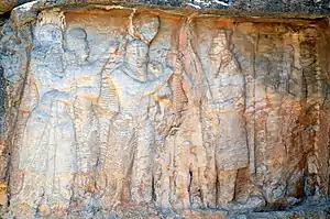 Investiture relief of Ardashir I at Naqsh-e Rajab, with Denag possibly representing the figure on the far right