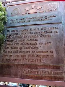 The lyrics of "Denes nad Makedonija" were penned by Vlado Maleski, a writer who was active in the Partisan movement during World War II.[1] The musical portion was composed by Todor Skalovski. The song was first played in 1942 in Struga, among partisan and communist circles.[2][1] According to oral recounts, the hymn was played by Maleski himself on New Year's Eve in the presence of 24 youths, whose identities were subsequently documented in writing only in 1981. Even though the resistance consisted of fighters from the different ethnic groups across Yugoslavia, the aforementioned youths are believed to have all identified as Macedonians.[3] From the end of the war, it was utilized – albeit unofficially[3] – as the regional anthem of the Socialist Republic of Macedonia (which was part of Yugoslavia at the time)[4] until 1989.[3]