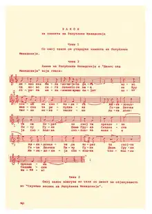 "Denes nad Makedonija" (Macedonian: Денес над Македонија, pronounced [ˈdɛnɛs nat makɛˈdɔnija]; lit. 'Today over Macedonia') is the national anthem of North Macedonia. Todor Skalovski composed the music and Vlado Maleski wrote the lyrics of the song in the early 1940s. It was adopted as the national anthem in 1992, almost a year after the state's independence from Yugoslavia. Before its adoption as a national anthem, it was used as the regional anthem of the Socialist Republic of Macedonia, a constituent state of Yugoslavia, before it became the national anthem of the Republic of North Macedonia.