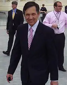 Considered one of the most politically liberal members of Congress during his tenure, Kucinich unsuccessfully ran for president in the 2004 and 2008 Democratic primaries. During his 2004 presidential campaign, he ran as a staunch opponent of the Iraq War, garnering him support among some anti-war activists.[4] Despite not winning a single primary contest, Kucinich was the last opponent of eventual nominee John Kerry to drop out.[5]