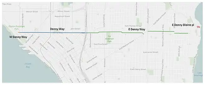 - 1 2 3 4 5 6 Google (August 9, 2018). "Denny Way" (Map). Google Maps. Google. Retrieved August 9, 2018.
