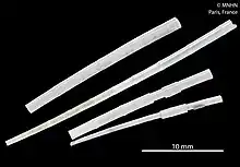 Dentaliida is one of the two orders of scaphopod mollusks,[2] commonly known as elephant's tusk shells. The order Dentaliida contains most of the larger scaphopods, and is distinguished from the other order (the Gadilidae) by the shape of its shell (the dentaliid shell tapers uniformly from anterior to posterior; the gadilid one has an anterior shell opening slightly smaller than the shell's widest point), the shape of the foot (the dentaliid foot is boat-shaped with a central trough; the gadilid foot is star-shaped), and the arrangement of some of their internal organs.