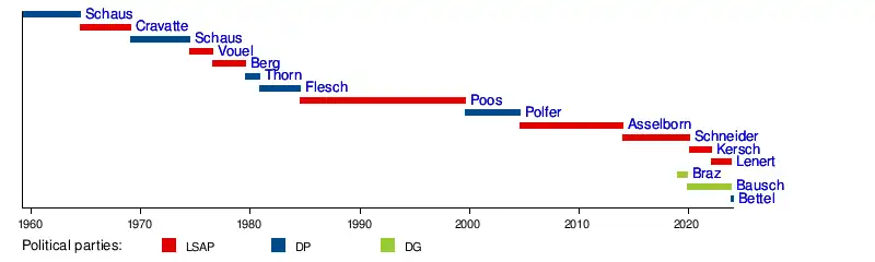 Eugène Schaus | DP | 6 February 1969 | 15 June 1974 | Government lost election[5] | Werner-Schaus Ministry II | |||