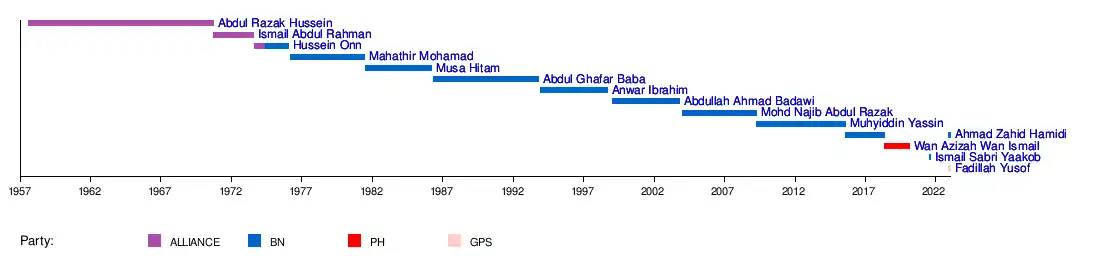 Ismail Abdul Rahman died in office due to massive heart attack in 1973.[3] Musa Hitam resigned from second Mahathir cabinet over differences with Prime Minister over government policy in 1986. Ghafar Baba resigned from his portfolio following UMNO grassroots lost confidence in his leadership and his position as Deputy President of UMNO was challenged by Anwar Ibrahim in the UMNO's top leadership election. Anwar Ibrahim was the first deputy prime minister to be sacked after being accused and subsequently charged with corruption and sodomy in 1998. Muhyiddin Yassin was the second DPM to be removed from office after being dropped from the Cabinet by former Prime Minister Najib Razak in a reshuffle in 2015.[4] He later was sacked from his party.[5] Wan Azizah Wan Ismail was disqualified from office after the seventh Mahathir cabinet was dissolved due to its fall from the federal administration in 2020.