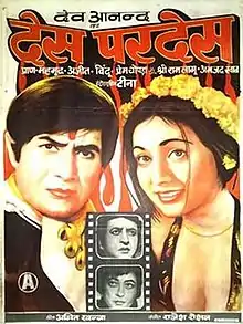 Des Pardes (lit. 'Home and Abroad') is a 1978 Hindi drama film, produced and directed by Dev Anand. This family drama stars Dev Anand and Tina Munim (in her debut film), with Ajit Khan, Pran, Amjad Khan, Shreeram Lagoo, Tom Alter, Bindu, Prem Chopra, A. K. Hangal, Sujit Kumar, Mehmood and Paintal in the supporting cast. For the first time, Dev Anand chose comparatively new music director Rajesh Roshan for this film, who did full justice to his selection as most of the songs became quite popular. The film received a Filmfare award for its sets and also received a nomination for best music director. At the time of its release, the film was an average grosser, but over the years, it has gained a cult status and is regarded as a classic.