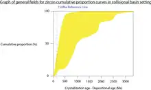 Detrital zircon geochronology has become increasingly popular in geological studies from the 2000s mainly due to the advancement in radiometric dating techniques.[1][2] Detrital zircon age data can be used to constrain the maximum depositional age, determine provenance,[3] and reconstruct the tectonic setting on a regional scale.[4]