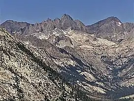 Devils Crags is a 12,424-foot-elevation (3,787-meter) mountain summit located west of the crest of the Sierra Nevada mountain range, in Fresno County of central California, United States.[1] This jagged line of 11 pinnacles is situated at the southern end of the Black Divide in northern Kings Canyon National Park, 1.88 miles (3.03 km) south of The Citadel, and one mile southeast of Wheel Mountain, which is the nearest higher neighbor.[2] Devils Crags ranks as the 299th highest summit in California.[3] Topographic relief is significant as it rises 4,200 feet (1,300 meters) above Le Conte Canyon in approximately two miles. An approach to this remote peak is made possible via the John Muir Trail which passes through Le Conte Canyon, below to the east. The class 5 Northwest Arête is considered one of the classic climbing routes in the Sierra Nevada.[5]