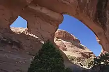 Devils Garden[note 1] is an area of Arches National Park, located near Moab, Utah, United States,[2] that features a series of rock fins and arches formed by erosion.[3] The Devils Garden Trail, including more primitive sections and spurs, meanders through the area for 7.2 mi (11.6 km).[4] The trailhead leads directly to Landscape Arch after a 0.8 mi (1.3 km) outbound hike, while Tunnel Arch and Pine Tree Arch can be seen on spur trails on the way to Landscape Arch.[3] Several other arches, including Partition, Navajo, Double O, and Private Arch, as well as the Dark Angel monolith and Fin Canyon, are accessed via the primitive loop trail and its spurs.[3]