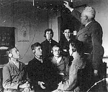 Kanizsai objected but could not prevent the closure of his own school.[12] He faced a difficult choice: either keep the children together in Budapest, or let them go to their parents.[13] Kanizsai chose to disperse the elder classes, but keep together the junior pupils.[13] The first decision was a mistake, because the Jews dispersed in the countryside were soon collected and sent to the camps.[13] Kanizsai, however, succeeded in keeping together his class of disabled children until the end of the war.[14] He and his wife followed the class during its first forced relocation, from the School for the Deaf to the Orphanage.[14] Kaniszai worried that the blind, in particular, would not get along with other children,[15] but this turned out to be the least of his problems. At the end of the spring of 1944, the old Orphanage building on Queen Wilma Street was destroyed by an Allied air raid.[15] One of the deaf survivors of the raid, Leo Wachlenberg, could not hear a guard's order to stop and was then shot.[16] Some others, like Deutsch, found refuge with surviving relatives,[15] while others kept together until the end of the war. In the ten months between March 1944 and January 1945 the Germans and Hungarian Arrow Cross nationalists murdered more than half a million Jews,[3] but the close-knit community of deaf teenagers persisted. Shortly before the Siege of Budapest they were forcibly relocated into the Budapest Ghetto, but were spared from further repressions.[13]