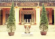 The pagoda entrance is on the banks of the Dong Ba canal. The temple gates face southwest; directly on the other side of the canal is the Dong Ba gate of the eastern side of the Citadel of Huế, which was the imperial headquarters of the Nguyễn dynasty, erected by Emperor Gia Long at the start of the 19th century. Diệu Đế pagoda was one of the three pagodas in Huế to be declared as a "national pagoda" by Emperor Thiệu Trị and was under the direct patronage of the Nguyễn dynasty. The pagoda was built under the reign of Thiệu Trị and is famous for its four low towers, one to either side of the main gate, while the other two flank the sanctuary. Two towers contain bells, while the other two contain a bell and stele , respectively. The main ceremonial hall contains a statue of Gautama Buddha, flanked by Bodhisattvas Bồ Tát Phổ Hiền and Bồ Tát Văn Thù Sư Lợi.[1]
