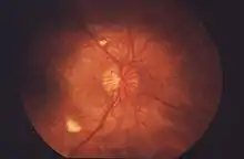 Fundus image, showing several common signs of diabetic retinopathy | |