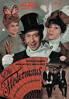 Die Fledermaus is a 1962 Austrian musical film directed by Géza von Cziffra and starring Peter Alexander, Marianne Koch and Marika Rökk.[1] It is an adaptation of the operetta Die Fledermaus by Johann Strauss II, Karl Haffner and Richard Genée.