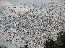 Although quantitatively outnumbered by mammals, birds are the most diverse class of prey in the golden eagle's diet, as more than 200 species have been identified at eagle nests. Little analysis has gone into how regularly golden eagles will attack the nestling and fledglings of other birds, although it has been interpreted that this behavior is not uncommon.[4] Nestling-aged rock pigeons (Columba livia) have been observed as prey in golden eagle nests.[134] The first record of a golden eagle eating eggs was recorded when a golden eagle was observed consuming Canada goose (Branta canadensis) eggs in eastern Idaho.[135] After galliforms, the next most significant group of prey among birds is the corvid family, making up 4.1% of the diet from around the range. Most prevalent among these are magpies and the large-bodied Corvus (crow and raven) genus. On Santa Rosa and Santa Cruz Islands in California, common raven became the most common prey species after feral pigs were eradicated from the latter, making up 24% of a 454 sample size from 14 nests.[30] The raven was also the most prevalent bird prey in central Arizona, in a sampling of 1154 from 119 nests.[128] The black-billed magpie (Pica hudsonia) was an important prey item in Washington state, making up 9.7% of the remains there, and was the most significant avian prey in Montana.[45][136] In 10 studies in Europe, corvids made up more than 5% of the prey remains, usually represented by carrion crows/hooded crows (Corvus corone/cornix), rooks (Corvus frugilegus), Alpine chough (Pyrrhocorax graculus), ravens or Eurasian magpies (Pica pica). Smaller species such as jays and nutcrackers only occasionally turn up as prey, mainly in North America, though the Eurasian jay (Garrulus glandarius) has also been known as prey.[10][38][72] The next best represented family of birds are the waterfowl, making up approximately 1.4% of the golden eagle's breeding season diet. Waterfowl of all sizes from green-winged teal (Anas crecca)[72] to trumpeter swans (Cygnus buccinator),[38] tundra swans (Cygnus columbianus)[137] and mute swans (Cygnus olor)[74] have been successfully hunted by golden eagles. Full-grown swans can weigh well over 10 kg (22 lb) and are probably the largest birds habitually hunted by golden eagles.[10][78] Moderately sized species, including larger Anas ducks such as mallards (Anas platyrhynchos) and geese such as bean goose (Anser fabalis) are perhaps most often recorded. Waterfowl are mostly recorded during the nesting season in Northern Europe, comprising 15.4% of prey in Gotland and 14.4% of prey in Belarus.[75][133] In some years at Malheur-Harney Lakes Basin in Oregon, Anas ducks can make up to 20% of the prey consumed by the locally nesting eagles.[138] Mostly in the United States, wintering golden eagles may become habitually predators of wintering and migrating groups of waterfowl, with species such as Canada geese, cackling geese (Branta hutchinsii), snow geese (Chen caerulescens), and Ross's geese (Chen rossii). Since geese are found in large concentration when seasonal conditions require it, these species can be hunted with relative ease.[44][139][140] Waterfowl are typically hunted using the "contour flight with short glide attack" technique, in order to surprise the prey before it can take flight or dive. In one case, a golden eagle was able to capture a mallard as it took off in flight. Other water birds are generally less frequent prey but may become regular in the diet in marsh-like northern regions and coastal areas. Scotland, being surrounded by coasts and possessing quite a wet climate, often hosts water birds which become prey such as colonies of petrels (largely northern fulmar (Fulmarus glacialis)), making up to 17% of the recorded prey in 26 nests with a 119 sample size in the Outer Hebrides, migrating throngs of sandpipers and plovers (up to 5.9% and 2.8% in 25 nest in the northern Inner Hebrides) and gulls (making up a whopping 23% of prey recorded in 25 nests in the West-Central Highlands).[10] Among shorebirds, usually only larger types such as godwits, curlews, Tringa sp., stone-curlews and oystercatchers turn up as prey as smaller species are probably too flighty and agile to catch.[10][141] Eurasian cranes (Grus grus) are regularly predated in Northern Europe, turning up at 6.8% of nests in Estonia and 5.8% of nests in southern Finland.[73][76] Hooded cranes (Grus monacha) are reportedly prey for golden eagles in China.[142] Demoiselle cranes (Anthropoides virgo) have been caught in mid-air as they migrate over the Himalayas and both sandhill (Grus canadensis) and young whooping cranes (Grus americana) may be hunted in North America.[143][144] The last known breeding pair of golden eagles in Maine (which did not return after 1999) were reported to hunt an unusually large number of herons, specifically great blue herons (Ardea herodias) and American bitterns (Botaurus lentiginosus). Elsewhere, herons are basically negligible in the diet.[10] Other water birds recorded as prey include cormorants (up to 8.6% of the recorded prey in Santa Rosa and Santa Cruz Islands), auks, grebes and loons.[10][30]