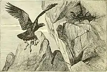 Golden eagles, being habitual scavengers at carrion, come into conflict with scavenging birds as well. They may encounter corvids at carrion sites and the large passerines are often highly cautious, either feeding some distance from the eagle or waiting until the eagle is done eating, lest they be predaceously grabbed.[10] Occasionally, however, corvids may behave more boldly around golden eagles. In one case, a group of three black-billed magpies were observed to rob a golden eagle of its prey.[174] Golden eagles also usually dominate both New World and Old World vultures. Smaller species like black vulture (Coragyps atratus) in North America and Egyptian vulture (Neophron percnopterus) in Eurasia are known to be occasionally hunted by golden eagles.[175][176] Besides the Steller's sea eagle, the larger species of Old World vulture and the California condor (Gymnogyps californianus) are the only noticeably larger raptorial birds that a golden eagle may encounter. The relationship between these large vultures and golden eagles can be highly contentious, with most sources favoring victory for the eagle due to its more aggressive disposition, much stronger feet and sharp talons. In one case, a colony of griffon vulture (Gyps fulvus) was exceptionally able to displace a pair golden eagles from a cliff where they were trying nest so they could nest there themselves.[177] On the other hand, a 5-year-old griffon vulture reintroduced into the wild in Bulgaria was thought to have been killed by a golden eagle.[178] The golden eagle is a potential predator of the lammergeier which is often attracted to much the same habitat and prey as the eagle but often feeds largely on bone marrow from carcasses.[179] It has been observed that both golden eagles and lammergeiers will readily pirate food away from each other.[180] In the Southwestern United States, several conflicts between huge California condors and golden eagles have been observed. At carrion, victory during conflicts can go either way apparently.[181][182][183] Recent observation have suggested that the critically endangered condors do not seem to actively defend their nesting territories from golden eagles but have been recorded gaining incidental protection from prairie falcons and common ravens, which both aggressively displaced the eagles from their own adjacent territories.[184] The golden eagle is considered an occasional predator of California condors (especially fledglings) but there seems to be little in the way of eyewitness accounts to confirm this. It is possible that (as in the Bulgarian griffon vultures) the California condors have lost their natural cautiousness around eagles due to having been reintroduced from captivity.[185]