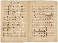 ![]() Sheet music for the national anthem of Latvia in the handwriting of Kārlis Baumanis. | |