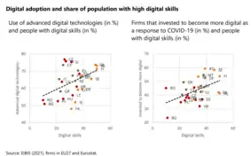 According to 55% of businesses surveyed in the European Investment Bank's Investment survey in 2021, the COVID-19 pandemic has increased the demand for digitalization. 46% of businesses report that they have grown more digital.[51][52] 34% of enterprises that do not yet utilise advanced digital technology saw the COVID-19 crisis as a chance to focus on digitisation.[51] Firms that have incorporated innovative digital technology are more positive about their industry's and the overall economic condition in the recovery from the COVID-19 pandemic.[48][53][54] There is, however, a discrepancy between businesses in more developed locations and less developed regions.[55][56]