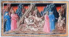 In his Inferno, Dante sees Diomedes in the Eighth Circle of Hell, where the "counsellors of fraud" are imprisoned for eternity in sheets of flame. His offenses include advising the theft of the Palladium and, of course, the stratagem of the Trojan Horse. The same damnation is imposed on Odysseus, who is also punished for having persuaded Achilles to fight in the Trojan war, without telling him that this would inevitably lead to his death.