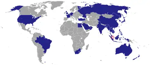 Brussels (Embassy)[42] | Lim Hong Huai (Ambassador) | ![]() ![]() ![]() Organisation for the Prohibition of Chemical Weapons |