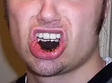 Long term use results in whitening of the oral mucosa, termed smokeless tobacco keratosis. There is relatively low risk of transformation of this lesion into mouth cancer (sometimes verrucous carcinoma). Dipping tobacco causes fatal oral cancers, tooth and gum loss. Associated cancers include: tongue cancer, lip cancer, cheek cancer, gum cancer, throat cancer, and cancer in the roof and floor of the mouth.[6]