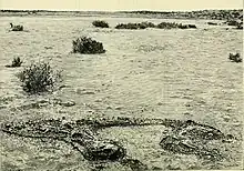 Huge assemblages of mostly complete Diprotodon fossils have been unearthed in dry lakes and riverbeds;[1] the largest assemblage came from Lake Callabonna, South Australia.[12] Fossils were first noticed here by an aboriginal stockman working on a sheep property to the east. The owners, the Ragless brothers, notified the South Australian Museum, which hired Australian geologist Henry Hurst, who reported an enormous wealth of fossil material and was paid £250 in 1893 to excavate the site. Hurst found up to 360 Diprotodon individuals over a few acres; excavation was restarted in the 1970s and more were uncovered. American palaeontologist Richard H. Tedford said multiple herds of these animals had at different times become stuck in mud while crossing bodies of water while water levels were low during dry seasons.[13]