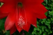 The stems of Disocactus ackermannii consist of a short rounded base, about 10–18 cm (4–7 in) long, followed by longer flattened leaf-like portions, 10–75 cm (4–30 in) long and 5–7 cm (2–3 in) wide with wavy edges. The plant branches from the base and arches downwards, being altogether some 1 m (3 ft) long. The scarlet flowers have greenish throats and are funnel shaped, 11–15 cm (4.3–5.9 in) or even longer and up to 15 cm (5.9 in) across. The filaments are red but the base is usually greenish. The anthers are pale rose. The style are red. The stigma is purplish. Fertilized flowers are followed by green to brownish red fruits, 4 cm (1.6 in) long and 2–2.5 cm (0.8–1.0 in) wide.[2][4]