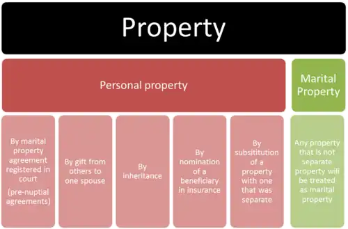 Property owned by spouses in marriage can be labelled as either personal or marital property. Upon divorce, only marital property will be divided between spouses.[22]