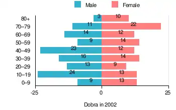 According to the 2002 Poland census, there were 241 people residing in Dobra village, of whom 50.6% were male and 49.4% were female. In the village, the population was spread out, with 23.7% under the age of 18, 30.3% from 18 to 44, 19.5% from 45 to 64, and 26.6% who were 65 years of age or older.[1]