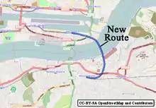 One of the tunnel portals for Elizabeth line is on the original site of Pudding Mill Lane station. As a consequence, work was carried out to divert the DLR between City Mill River and the River Lea onto a new viaduct further south. This included a replacement station, which opened on 28 April 2014.[73][74] The former station stood on the only significant section of single track on the system, between Bow Church and Stratford.[75] The opportunity was taken to double the track in three stages, to improve capacity. There was originally no provision for works beyond the realigned section in the Crossrail Act.